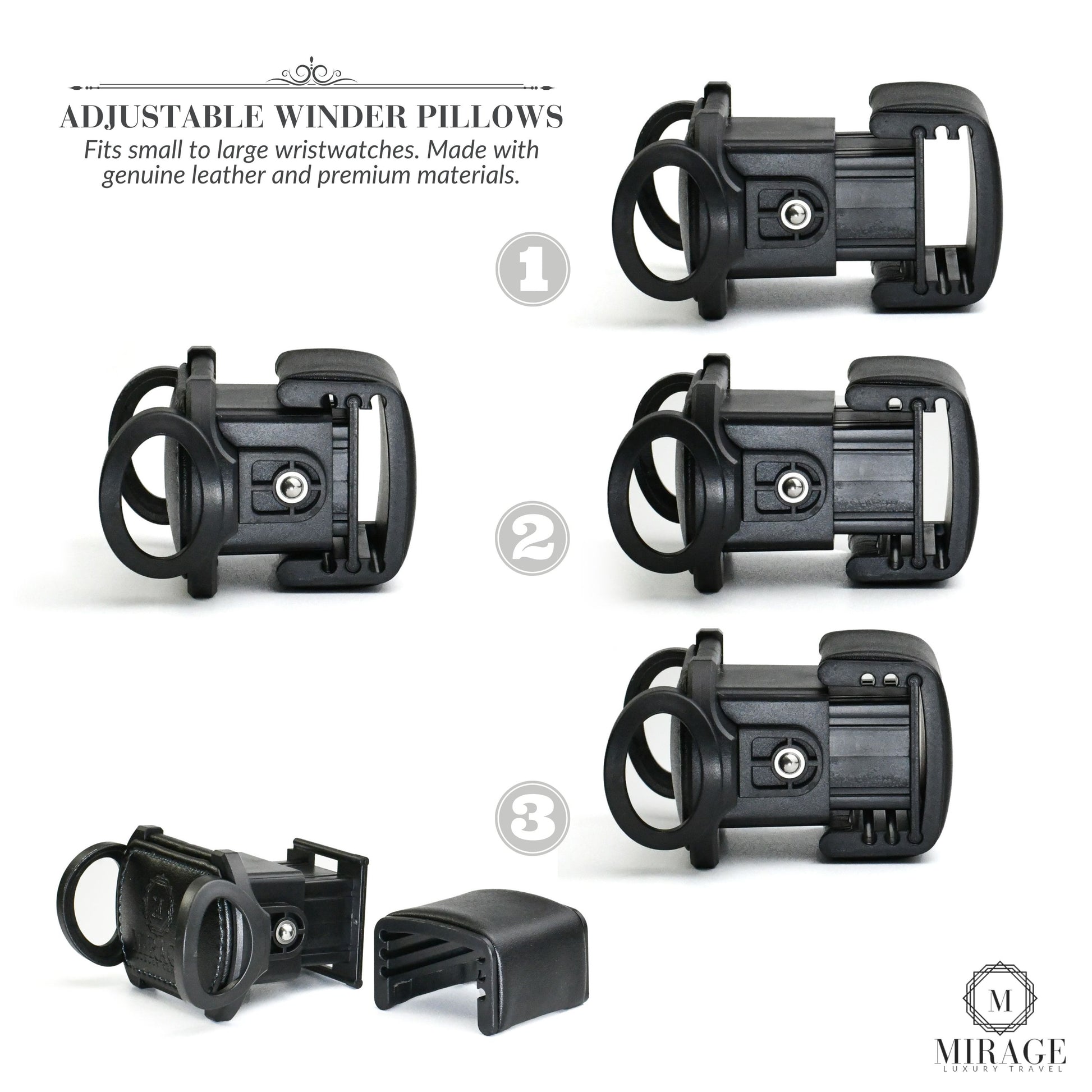 Adjustable Winder Pillow: Features a retractable pillow with adjustable base slots, designed to secure watches of all sizes. Bonus Flexibility: The pillow’s base is removable and adjustable to accommodate long, medium, and short watch bands for an impeccable fit.