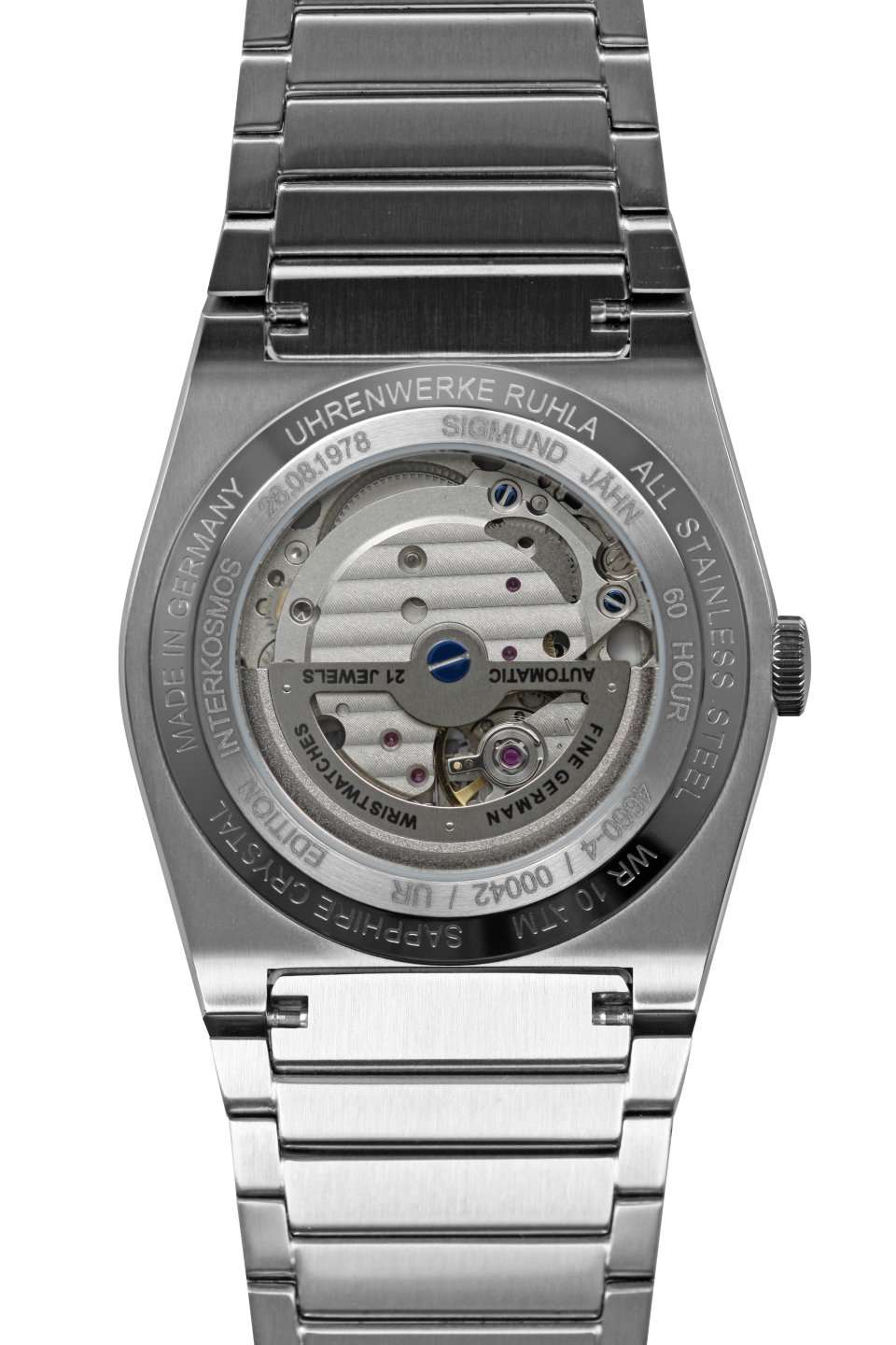 Dark green dial with silver numerals/indices, luminous hands Japanese automatic movement, Citizen-Miyota 8315, 21 jewels Sapphire glass Classic, analogue wristwatch in stainless steel case 40 mm x H 13 mm, water resistant to 10 bar Made in Germany, in-house production in Ruhla